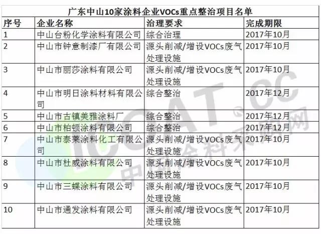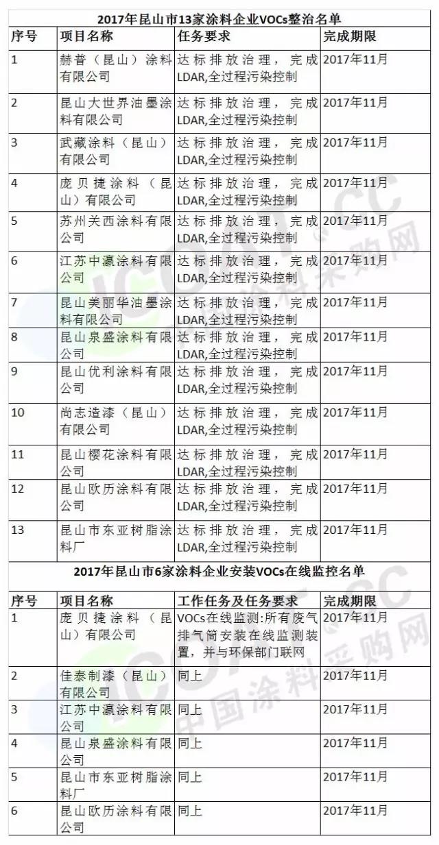 别 涛 VOCs治理工作将是大气污染治理的一个重点。随着环保力度的日益加大,全国各省市对VOCs治理工作越来越重视。日前,江苏昆山、浙江杭州、广东中山先后发布了2017年企业VOCs整治项目名单。据涂料采购网统计,此次,江苏昆山有13家涂料企业、浙江杭州大江东产业集聚区有3家涂料企业、广东中山有10家涂料企业被列入VOCs重点整治名单,从名单中,可以看出,有些大型涂料企业,如海虹老人、庞贝捷等也被列入。在完成期限方面,广东中山有7家涂料企业要求完成整治时间为今年10月,其他企业最晚在年底前完成整治。详情如下: 江苏昆山涂料企业VOCs整治项目